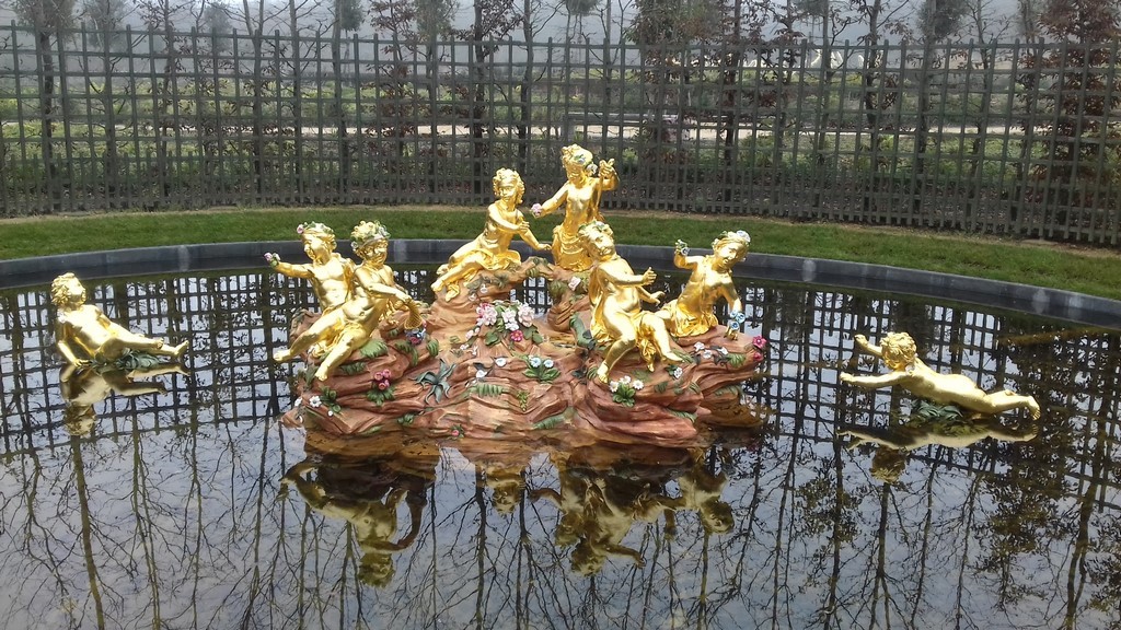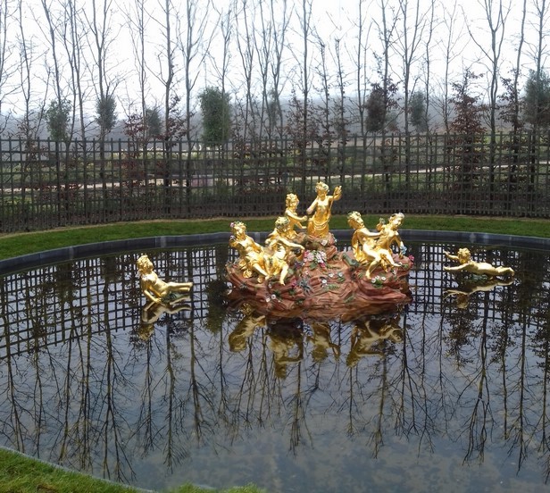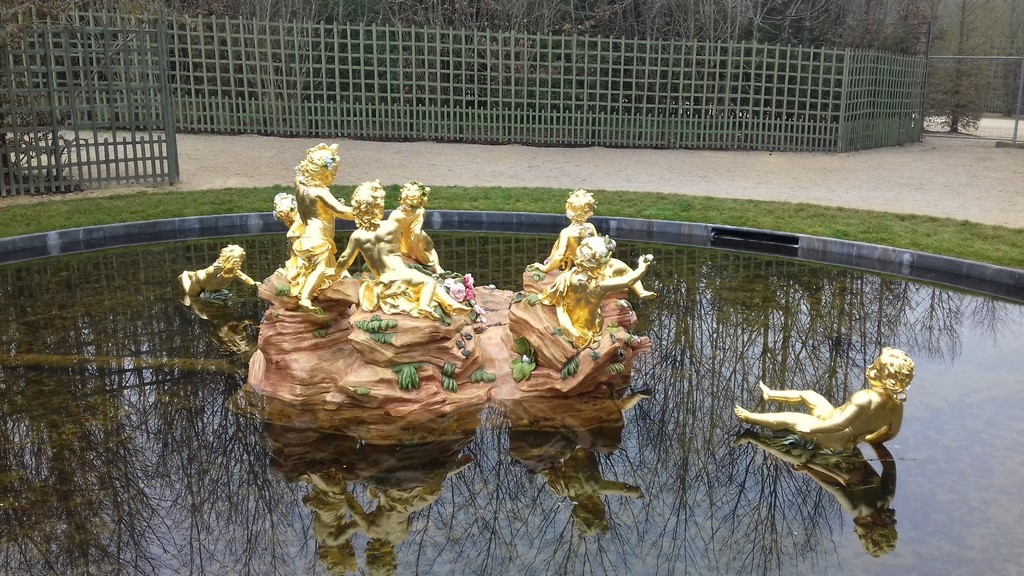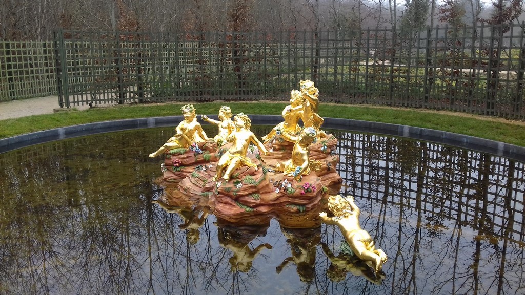Questa visuale di plastico rappresenta il passato, o meglio ciò che oggi non c'è più a Versailles fin dal 2014. La fontana circolare è la Fontana dei Putti, o dell'Isola felice, i percorsi geometrici che la affiancano all'interno del quadrato sono totalmente scomparsi in quanto è stato immesso il Boschetto del Teatro d'Acqua, che non ha nulla a che fare con quello sotto Luigi XIV, ma è un'opera moderna, ispiratasi per le fontane poste negli specchi d'acqua, ai disegni rappresentanti i passi che il Re Sole ha fatto per la danza di Apollo.
