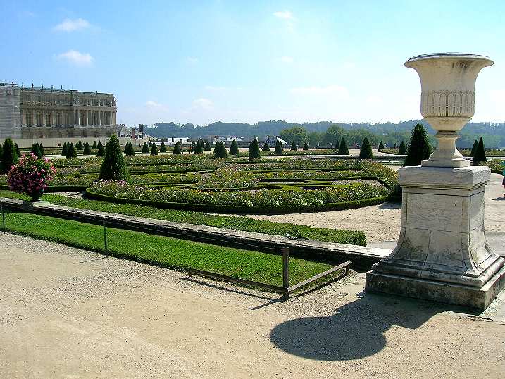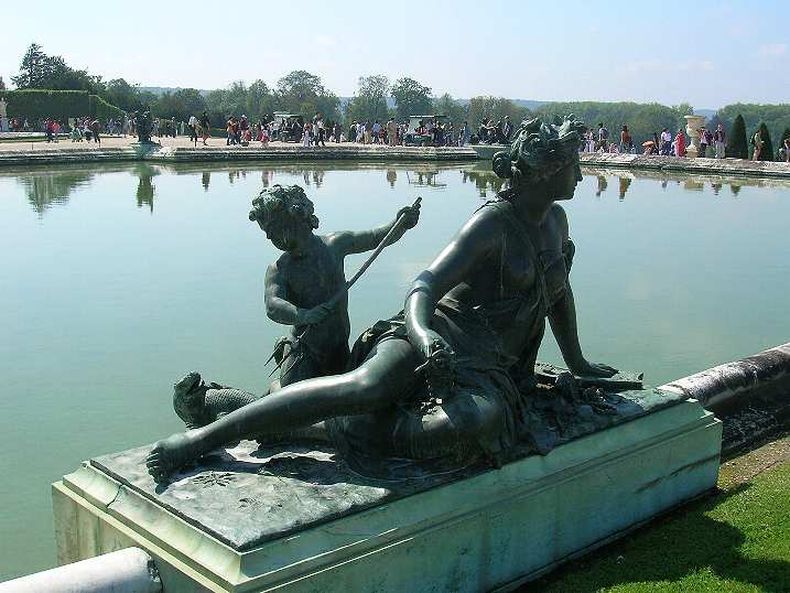 Parterre d'Eau Ai piedi della Galleria degli Specchi, inizia il punto di incrocio fra l'asse nord-sud e quello est-ovest Davanti Facciata Galleria degli Specchi, su fotografata dall'esterno (si trova al primo piano del Palazzo di Versailles), sono presenti due grandi vasche: una a destra ed una a sinistra, di cui le immagini fotografiche che seguono. Vasca di Sinistra Vasca a Destra dando le spalle al Palazzo di Versailles, ed avendo dinnanzi l'asse Est-Ovest Segue Schieramento di Statue attorno alla Vasca di Destra