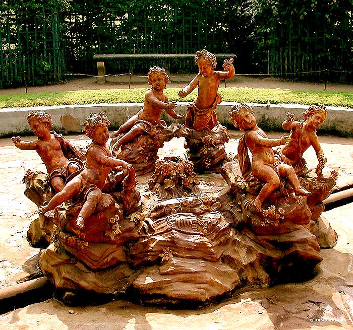 Questa visuale di plastico rappresenta il passato, o meglio ciò che oggi non c'è più a Versailles dal 2014. Mentre la fontana circolare è la Fontana dei Putti, o dell'Isola felice, i percorsi geometrici che la affiancano all'interno del quadrato sono totalmente scomparsi in quanto è stato immesso il Boschetto del Teatro d'Acqua, che non ha nulla a che fare con quello sotto Luigi XIV, ma è un'opera moderna, ispiratasi per le fontane poste negli specchi d'acqua, ai disegni rappresentati i passi che il Re Sole ha fatto per la danza di Apollo. Questa cosa la si può comprendere guardando dall'alto i bacini, ma siccome nessuno sorvola la Reggia nella visita, al fruitore del giardino le fontane sembrano un mucchio di tentacoli, certo in oro e cristallo di Murano, che escono dal livello delle acque.