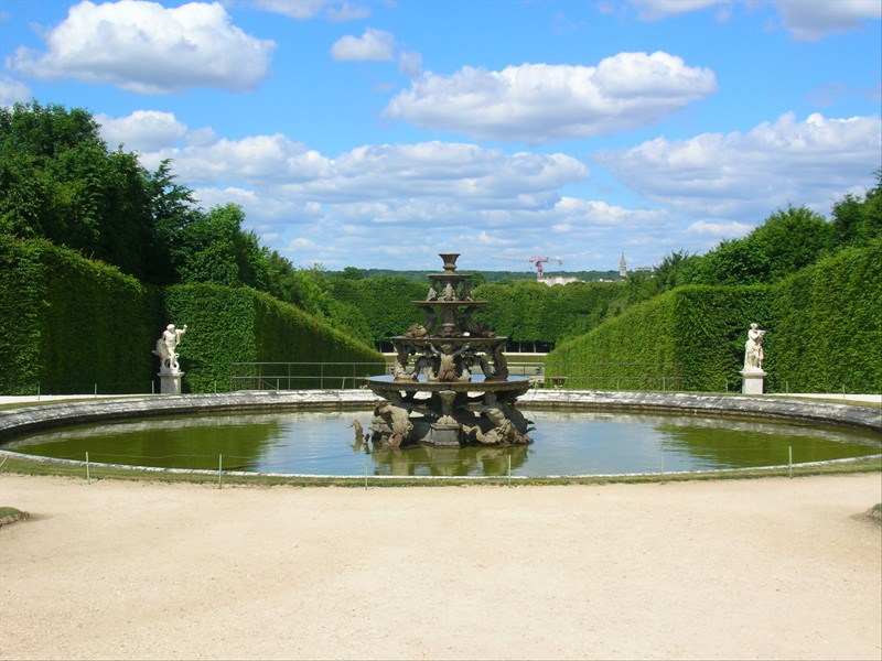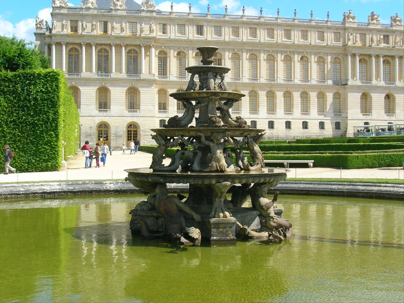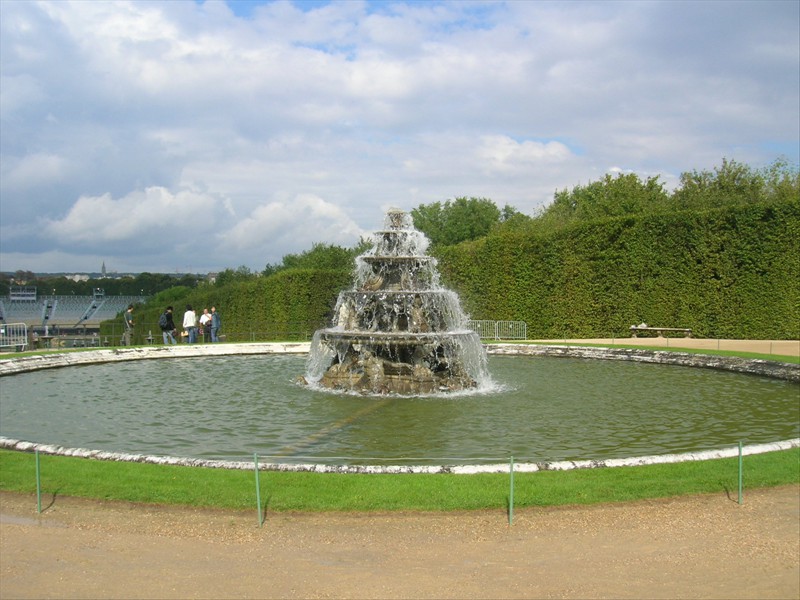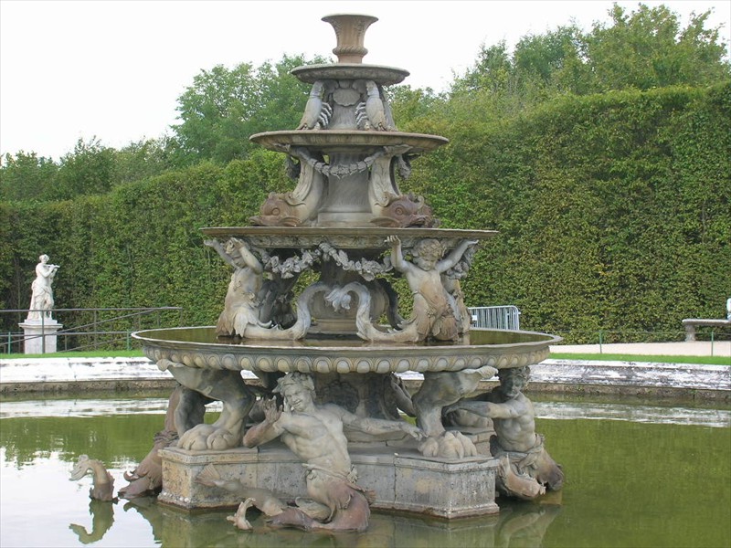 L’inaugurazione dei Grandi Giochi d’Acqua nel 1666 e il Grand Divertissement Royal del 1668 segnarono una tappa importante per la storia di Versailles: Luigi XIV apre allora la proprietà, fino allora riservata agli intimi, a tutti. Versailles divenne il quadro della messa in scena del Potere. Eppure dimora nei giardini un incantesimo che non deve nulla alla propaganda, in primis grazie alle fontane della famiglia Francine e di André Le Nôtre, che richiamarono il ricordo delle prime feste barocche. La Fontana della Piramide, che deve il suo nome alla sua forma e che fu disegnata da Charles Le Brun nel 1668, offre un lontano eco dell’esuberanza delle credenze e dei buffet caricati su vasellame d’argento, riempito di frutta e di marzapane, di cesti di impasti zuccherati, di tazze di cristallo per i gelati e delle caraffe di liquori. Tale era elemento basilare delle calde sere estive, quando uno spuntino era servito dentro una architettura effimera di qualche Boschetto.