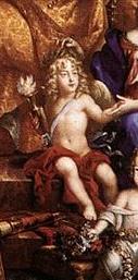 La Famiglia Reale raffigurata come divinità dell'Olimpo - opera di Jean Nocret Ma chi sono veramente tutti questi personaggi dipinti? Il Re Sole, chiaro lo si vede seduto a destra con scettro in mano con l'alloro posto sul capo. Ma tutti gli altri chi sono? E' il momento una volta per tutte di presentarli! Intanto è da sottolineare che Luigi XIV° si era fatto ritrarre con tutta la Famiglia nel 1670, da Nocret, pittore di Corte. Questo è uno degli esempi di come il Re amasse nella prima parte del suo regno, farsi rappresentare come un Dio ed in particolare Apollo, il Dio del Sole. Partiamo da sinistra, e scomponiamo il quadro personaggio per personaggio: