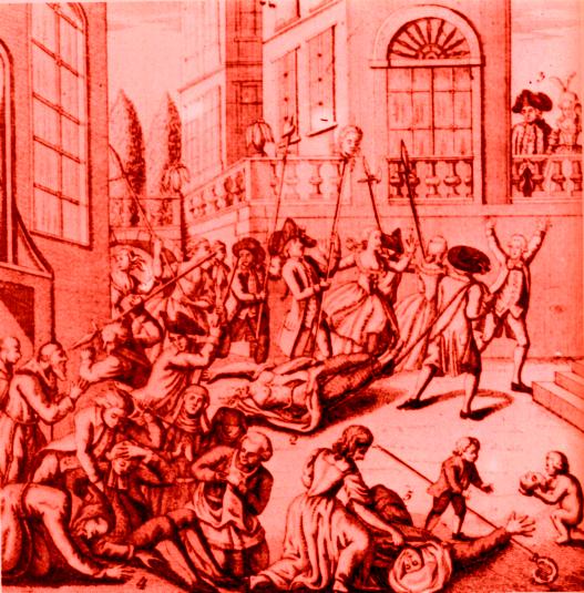 di Francia!" mettendosi alla difesa del palazzo di Versailles. Un'armata popolare d'aspetto terribile si presenta a Versailles ( 5 e 6 Ottobre 1789) con lo scopo di sequestrare la Famiglia Reale, trascinandola a forza a Parigi: erano convinti che se i Reali fossero risieduti nella Capitale, questo avrebbe scongiurato la fame. Agitando asce, picche, bastoni, aste, fucili: la marmaglia, di donne e di uomini camuffati in abiti femminili, irrompe dentro il Palazzo, distruggendo e devastando: il Re, tornato al Palazzo, e sempre ottimista disse: "Mi dicono che le donne di Parigi sono venute a chiedere del pane. Se ne avessi, non mi sarei trattenuto a darlo, evitando che venissero a chiedermelo. Andiamo a parlare con loro". "Gli aristocratici vogliono farci morire di fame!" - così esordì il portavoce dell'orda furente. Incalzano verso il Palazzo: si odono spari, ci sono feriti e morti: pietre e pallottole vengono scagliate dal popolo.