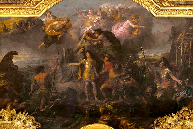 A sinistra della Prise de Maestricht, il Re si trova sulle rive del mare, la Previdenza assiste da una nuvola; il Re presenta la mano a Nettuno, che gli mostra che i flutti saranno favorevoli a suoi desideri. A destra del dipinto si trova Vulcano, che assicura la fabbricazione continua di armi. Dietro Marte sul suo carro gli conduce degli ufficiali e dei soldati. Apollo appare di sopra, in aria, presidiando le fortificazioni delle cittā. Plutone č posto su delle nuvole, con vasi colmi di monete. All'inizio della guerra d'Olanda, la Francia era presente sui mari con una sessantina di vascelli e trenta fregate. A cura di Arsace da Versailles |