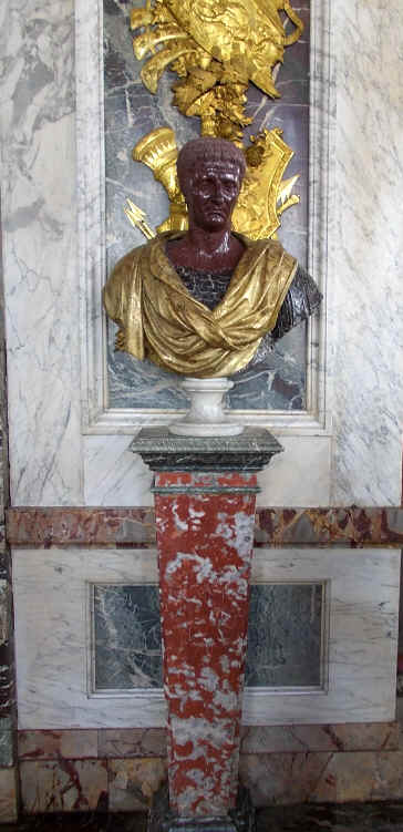 Concepita come un santuario della grandezza antica, la Grande Galleria accoglie i più bei pezzi delle collezioni reali: otto statue e due serie di busti rappresentanti i 12 Cesari, simbolo dell'apogeo del potere romano imperiale, riassunto della perfezione politica di cui Luigi XIV intendeva assumerne l'eredità. Nel 1687, i busti di uno delle due serie erano sistemati nel Salone della Guerra e della Pace, probabilmente sei in ciascuna sala. Forse donati al Re dal Cardinale Bouillon, questi busti erano in sostanza delle teste di porfiro, considerate antiche, che lo scultore François Girardon aveva dotato di completamenti in marmo e di drappi in bronzo dorato, realizzati dallo scultore e fondatore Pierre Le Nègre. I 12 busti furono trasferiti alle Tuileries nel XIX-esimo secolo e solo due di loro, sfuggite all'incendio del 1871, hanno potuto rientrare a Versailles. Si tratta di Claudio e di Domiziano, disposti da una parte e dall'altra dell'arcata che danno verso la Grande Galleria.