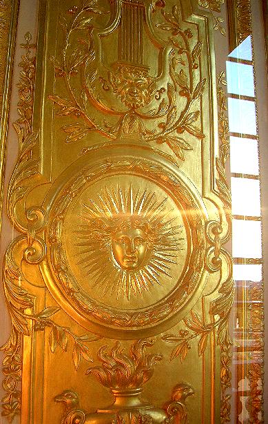 Volgendo lo sguardo verso l'alto del medaglione E' solamente nel 1833 che esso giunse a Versailles, ma, trasformato ed ingrandito, fu posto nel vestibolo della Cappella: osservandolo da vicino, si scorgono le tracce del suo formato iniziale, che corrispondono alle dimensioni del medaglione del Salone della Guerra.
