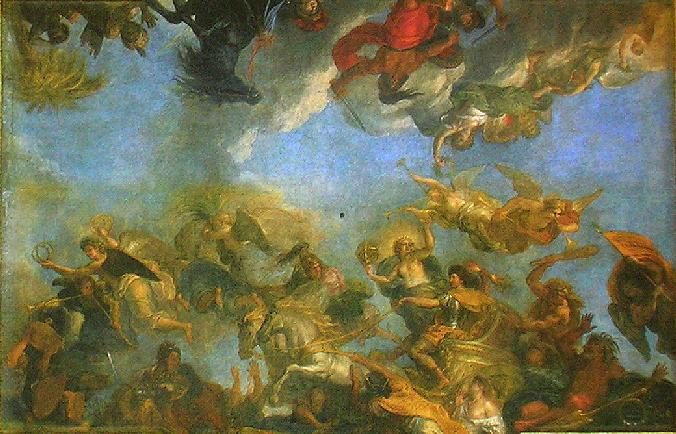 Lui, quando passava il Reno, era sul suo carro tirato da dei cavalli marini molto imbizzarriti, come Apollo. Aveva le braccia e le cosce gloriosamente nude, una armatura d’oro, dei lauri in testa al di sopra della parrucca, la Gloria in persona, tutta sfavillante, ai suoi lati, La Fama che suona la tromba nelle nuvole sopra di lui.